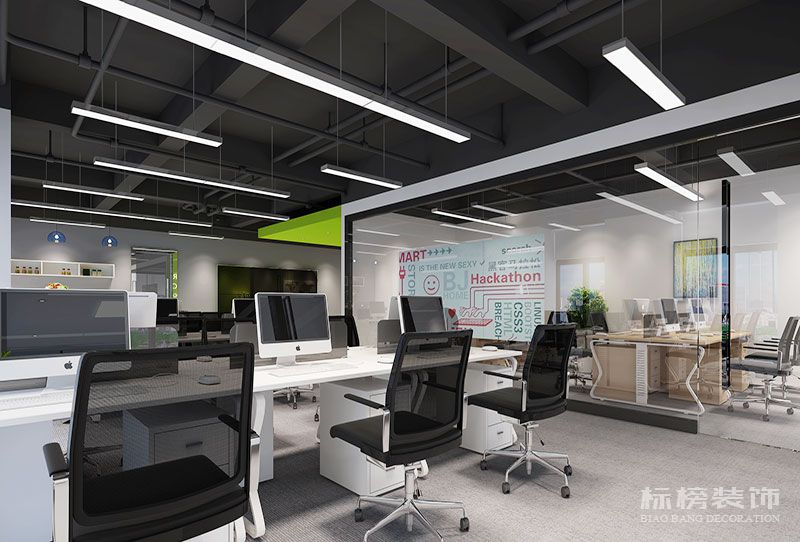 此辦公室主要以白色為主,灰色與綠色來(lái)點(diǎn)綴空間,多采用玻璃隔墻來(lái)區(qū)分區(qū)域,后期玻璃上將貼關(guān)于公司文化磨砂紙,既能有個(gè)人的私密性,又能展示公司的文化。辦公室照明以吊線燈為主,簡(jiǎn)單美觀又能足夠的明亮。
